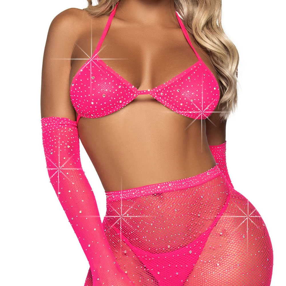 Ta čudovit mrežast komplet s svetlikajočimi diamantki sestavlja bikini top, rokavice, krilo s paščki za pripenjanje nogavic, nogavice in tanga hlačke.