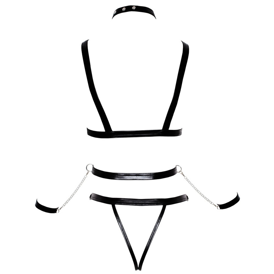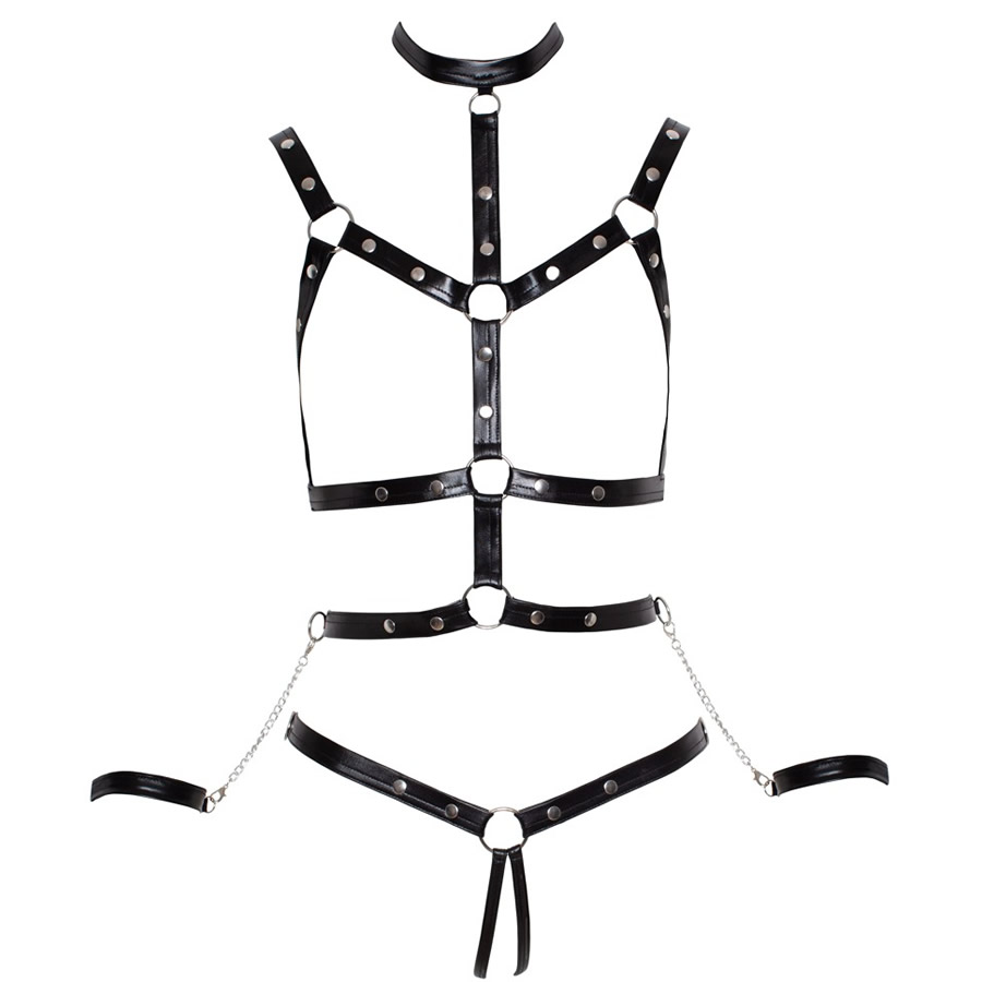 Mehki jermeni tega harnesa iz wetlooka so posuti z dekorativnimi kovinskimi zakovicami. Na bokih sta dodana kovinska obročka kamor se pritrdi verižica z lisicami za roke. Spodnji del – hlačke so ločene od zgornjega dela s pritiskači. Velikost: S – L