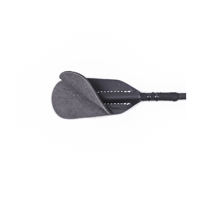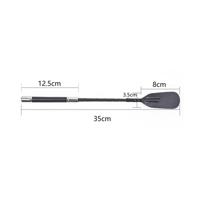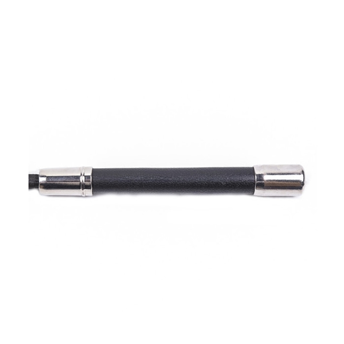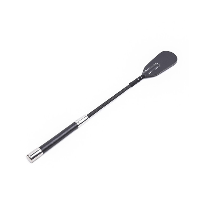 Eleganten bič za šeškanje je izdelan iz kombinacije umetnega usnja in kovine v srebrni barvi.  Ima ploščato konico iz dveh plasti.