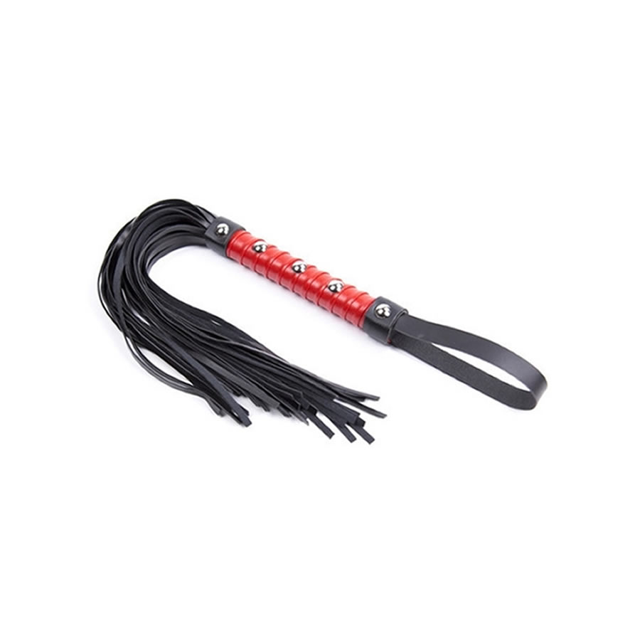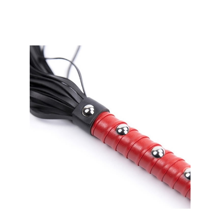 Bič z mehkimi resicami, s kratkim ročajem v rdeči barvi. Z zanko za okrog zapestja.  S srebrnimi kovinskimi zakovicami na ročaju.