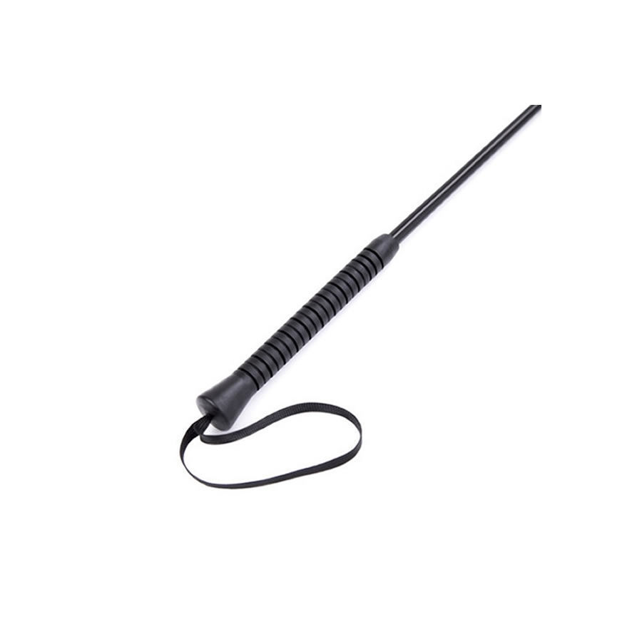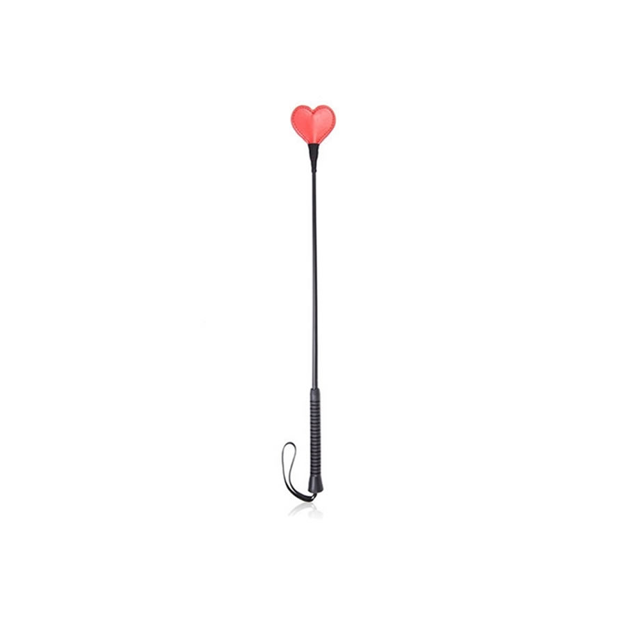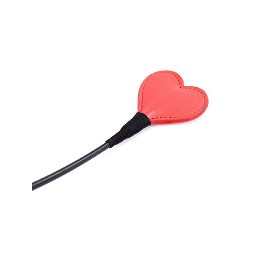 Bič za šeškanje, s kratkim ročajem z zanko za okrog zapestja in s čvrsto konico v obliki srčka. Izdelan iz umetnega usnja.