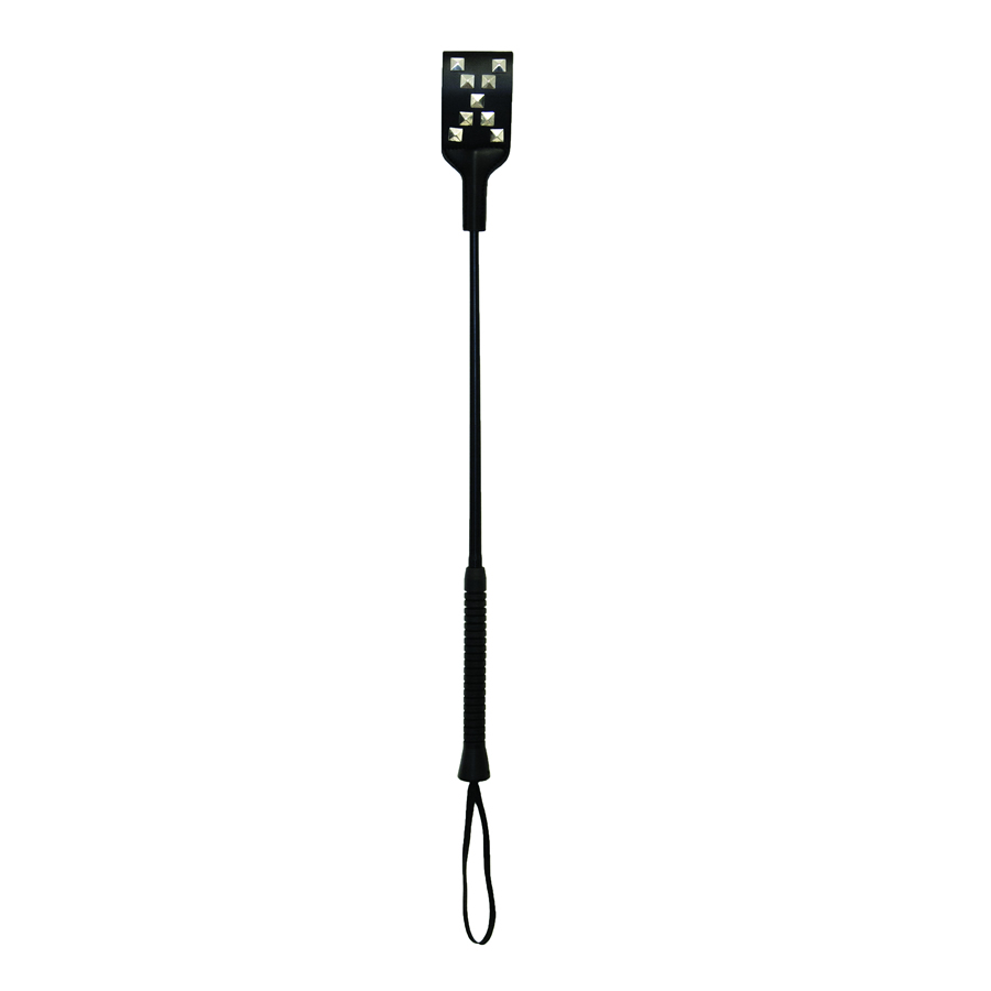 Bič s čvrstim ročajem in priročno zanko za okrog zapestja. Bič ima kovinske zakovice v obliki črke X na eni strani in v obliki črke O na drugi strani. Odličen za šeškanje!