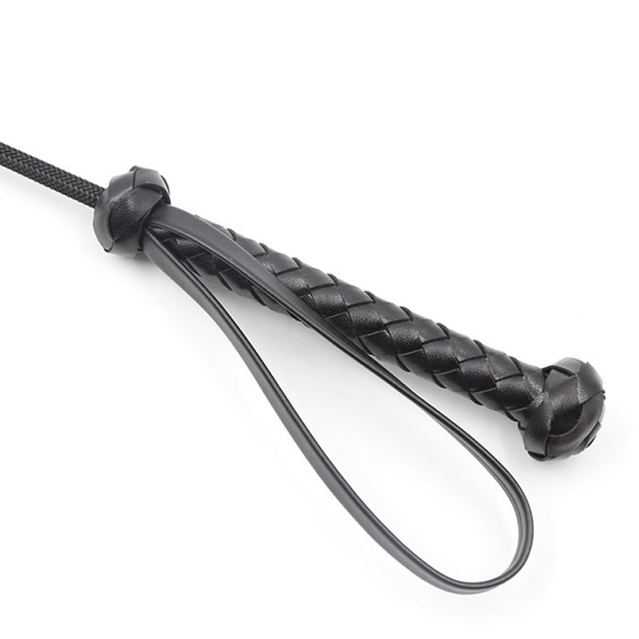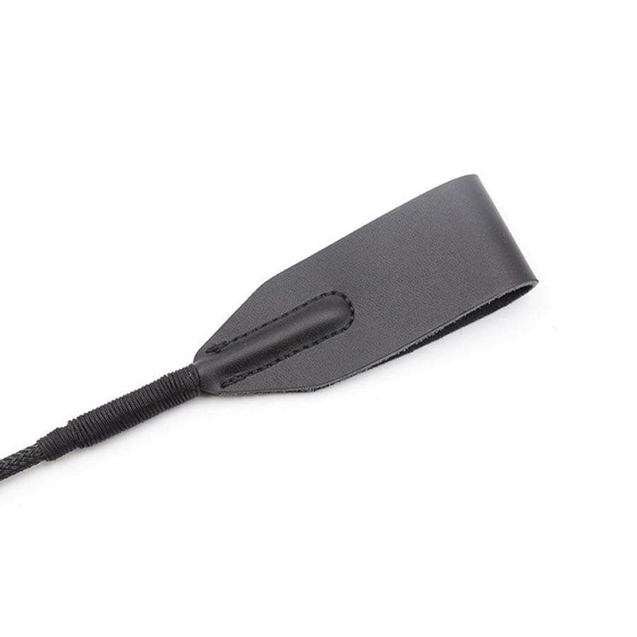 Daljši bič za šeškanje z razširjeno ploščato konico. Ročaj biča je pleten in na vsaki strani ročaja okrašen z debelejšim pletenjem. Z zanko za okrog zapestja.