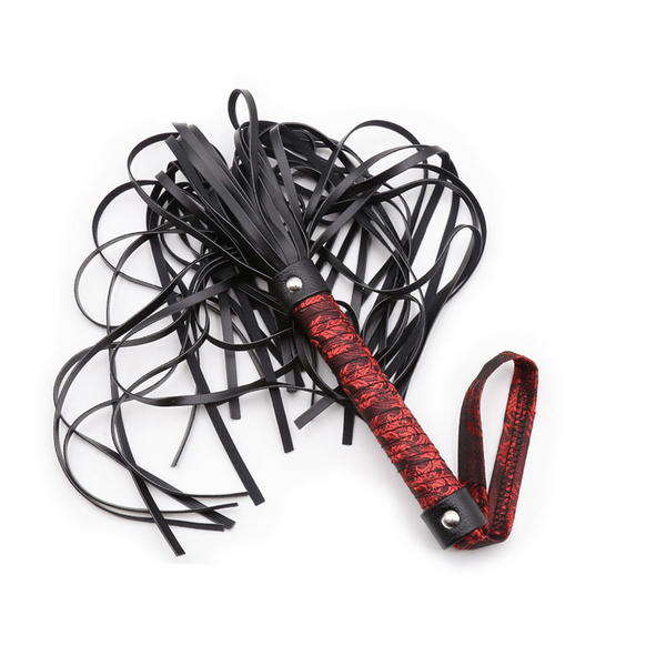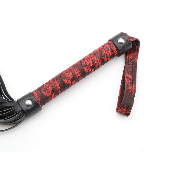 Eleganten bič z mehkimi resicami izdelanimi iz umetnega usnja. Ročaj je ovit v rdeč satenv vzorcu brokata. Bič ima zanko za okrog zapestja.