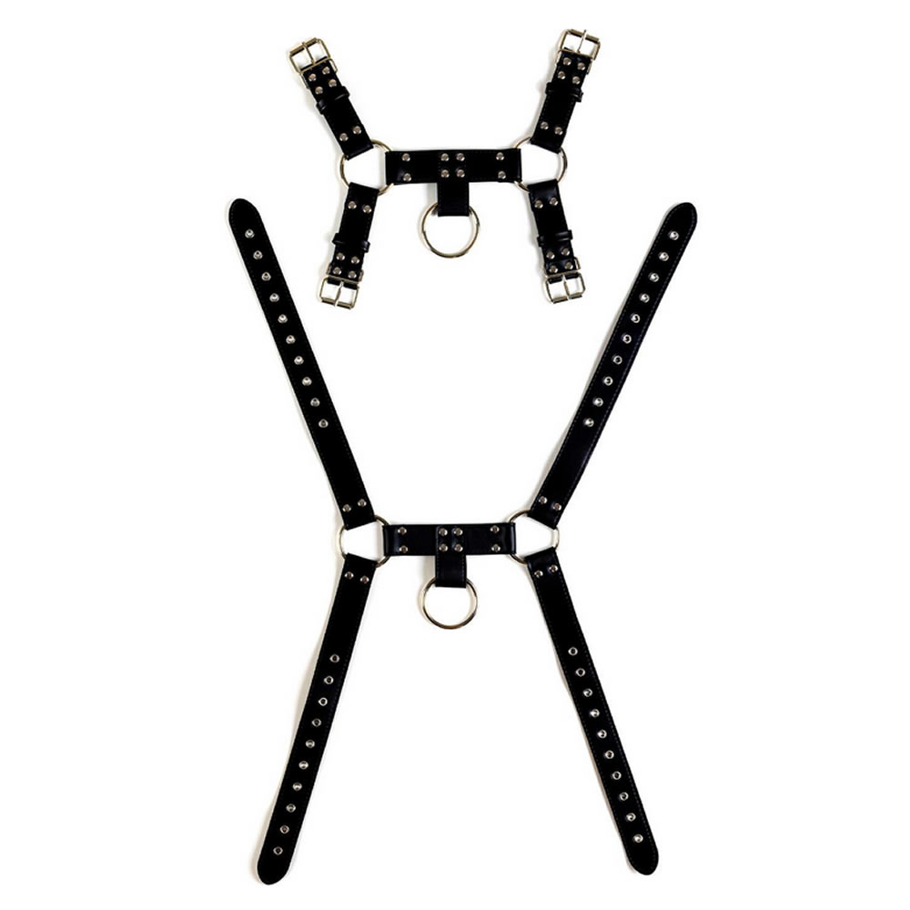 Ta harness pas za moške je popolnoma prilagodljiv, da ustreza vsakemu uporabniku. Izdelan je iz veganskega usnja, za kontrast so uporabljeni srebrni kovinski obroči in zakovice.