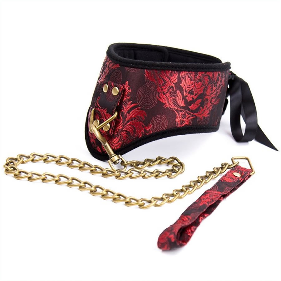 Elegantna ovratnica iz brokata je široka (višina je 7 cm), notranjost je mehka za bolj udobno nošenje. Ovratnica se na hrbtni strani zaveže s trakom, da se prilagodi dolžina. Ob strani se zapenja z ježki. Na sprednji strani je kovinski obroček za vpenjanje povodca ali katere druge fetiš igračke. Povodec je v zlati barvi, z mehko zanko iz brokata.