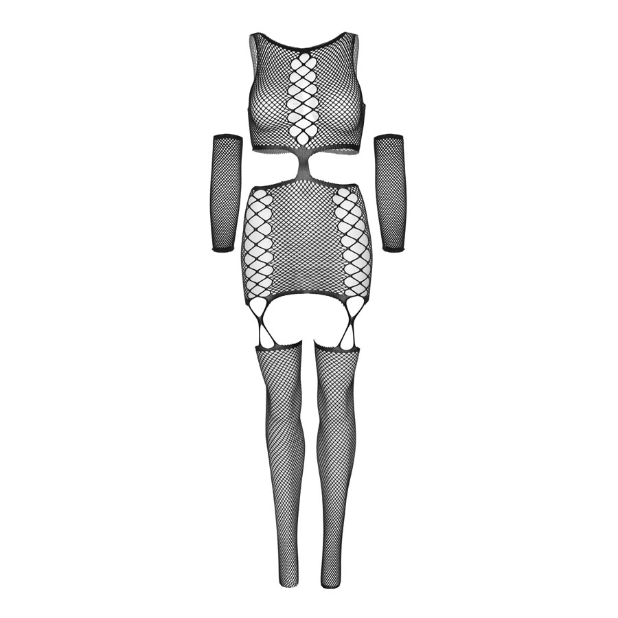 Seksi mrežasta obleka iz dveh delov je povezana z nogavicami v en kos oblačila. Je elastična in se povsem prilega telesu. Priložene so ujemajoče rokavice.