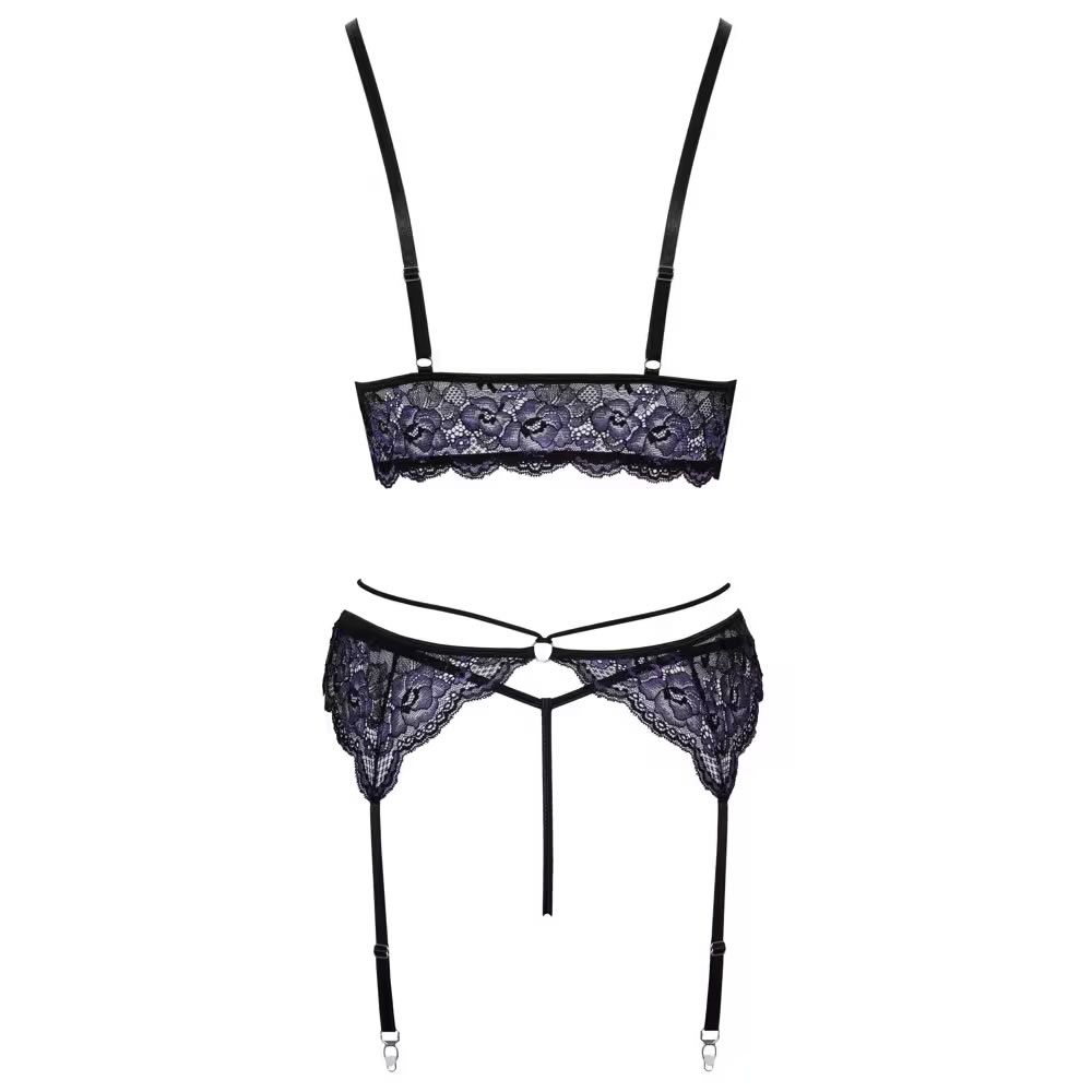 Čudovit komplet v črno vijolični kombinaciji s čipko v cvetličnem vzorcu vsebuje modrček, pas za nogavice in tangice.