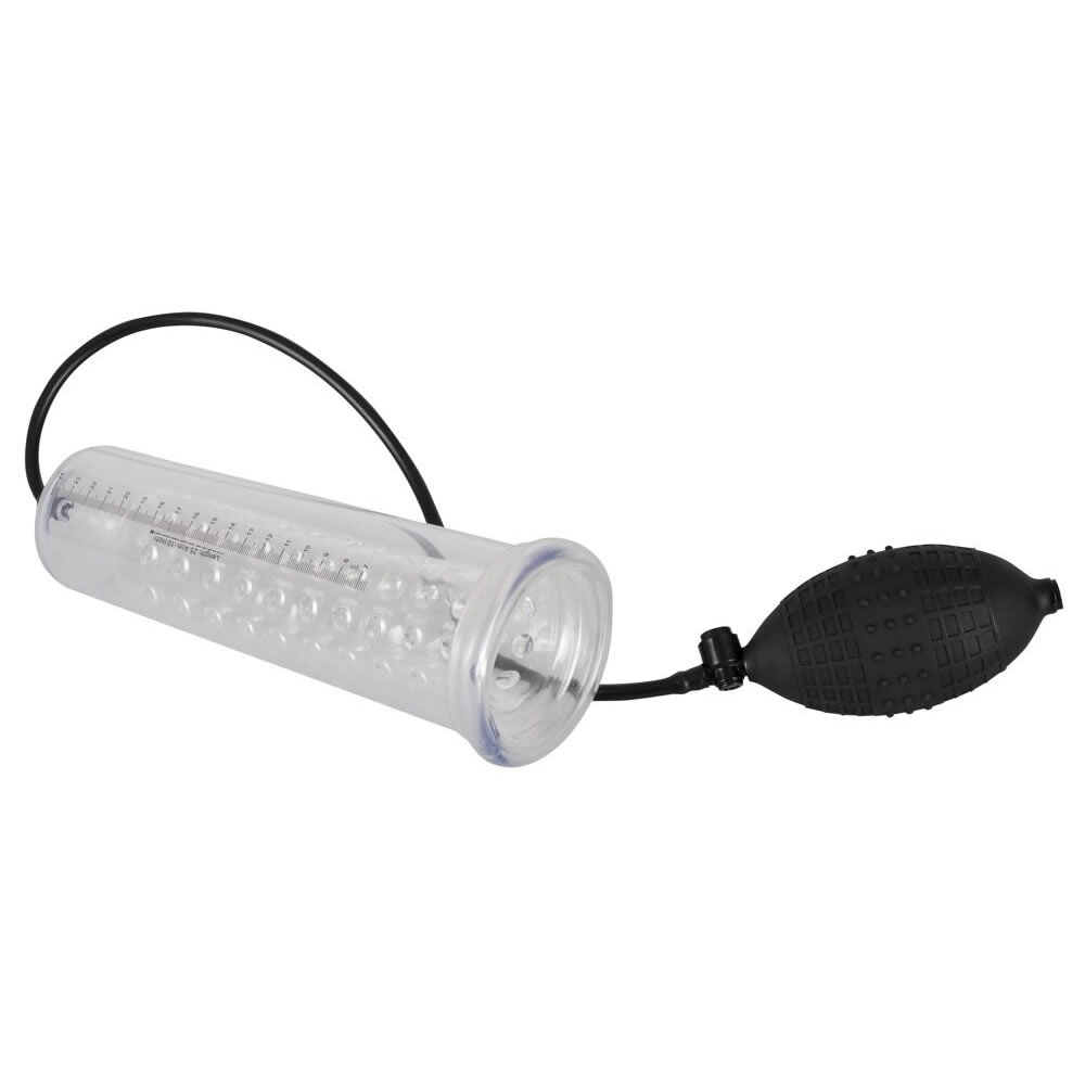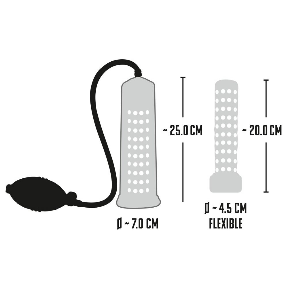 Transparentna črpalka za penis, z mehkim, zrnastim notranjim tulcem, s priročno črpalko za penis. Z merilno skalo lahko vidite, za koliko se je vaš penis povečal. Z varnostnim tlačnim ventilom. Cilinder pribl. 25 cm dolg.
