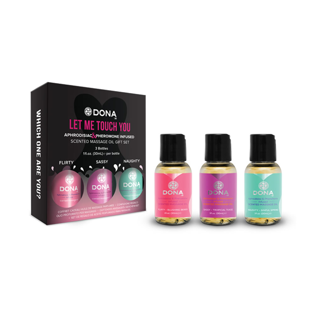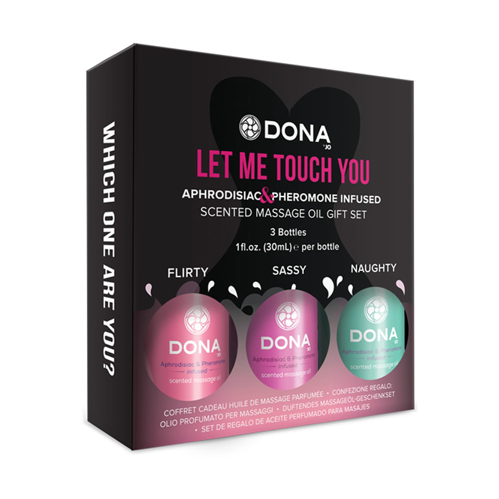 Vstopi k ljubimcu z Dona darilnim setom masažnih olj. V treh dišavah, da zadovoljijo vsa tvoja razpoloženja, so Dona Scented masažna olja obogatena z afrodiziaki in feromoni, da vzpodbudijo poželenje med vama in odpravijo napetost. Naj se tne more upreti tvojemu dotiku, ko se potopiš v aromatično blaženost.
