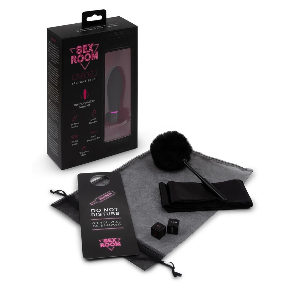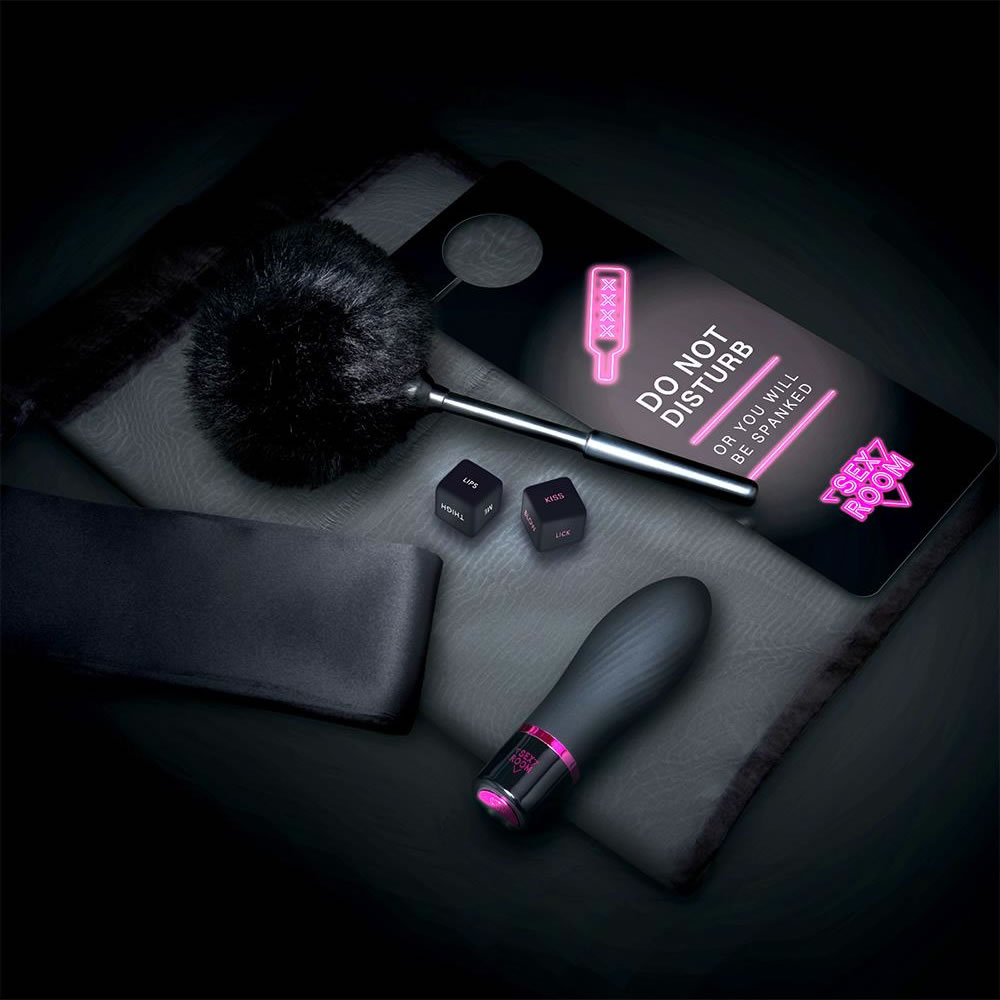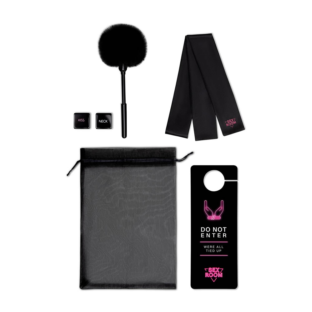 Ta set je popoln komplet za spreminjanje katerega koli prostora v poredno igralnico. Komplet vključuje kocke za predigro, žgečkalo iz perja, satenast trak za čez oči, močan vibrator in vrečko za shranjevanje igrač iz organze.