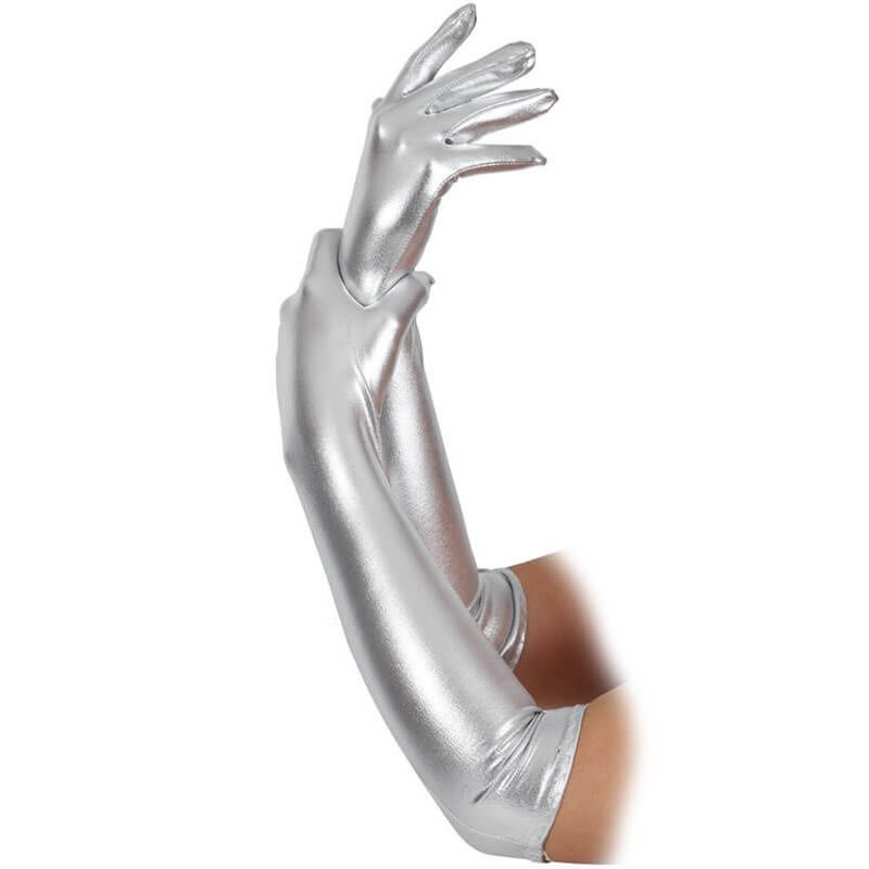 Dolge rokavice v srebrni barvi segajo nad komolec. Izdelane so iz sijočega, elastičnega wetlooka v srebrni barvi.