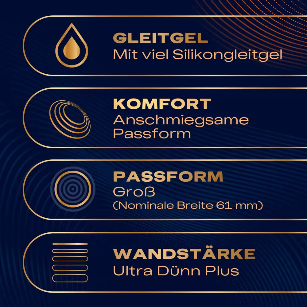 Izjemno tanki, večji, prozorni kondomi brez lateksa – izdelani iz nitrila. Kondomi so navlaženi z velikodušno količino silikonskega lubrikanta. Intenziven prenos telesne toplote za vrhunski realističen občutek.
