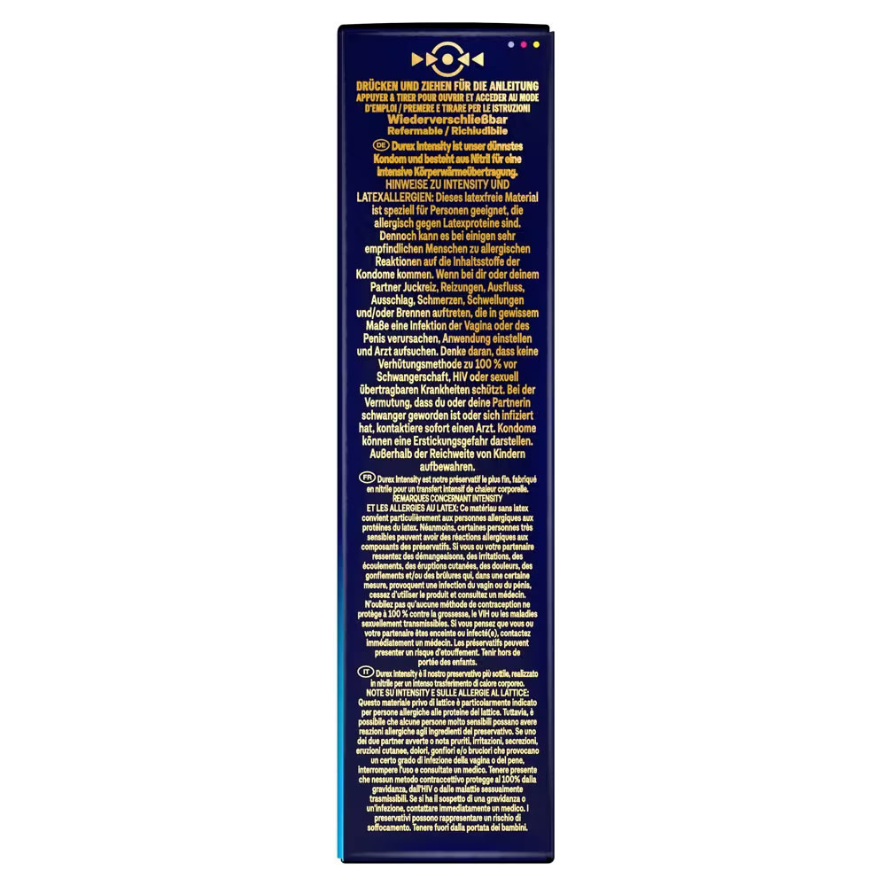 Vrhunski realističen občutek brez lateksa! Izjemno tanki in večji kondomi brez lateksa Intensity znamke Durex so izdelani iz nitrila za intenziven prenos telesne toplote in občutek, da uporabnik čuti samo svojega partnerja in nič drugega. Prekriti so z velikodušno količino maziva na osnovi silikona.