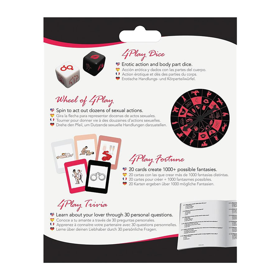 Set 4 vznemirljivih iger! Vsaka igra vključuje seksualne naloge, ki jih izvedeš s svojim partnerjem. Igraj, vrzi kocko, uporabi karte ali zavrti kolesce, da zagreješ stvari za vročo noč!