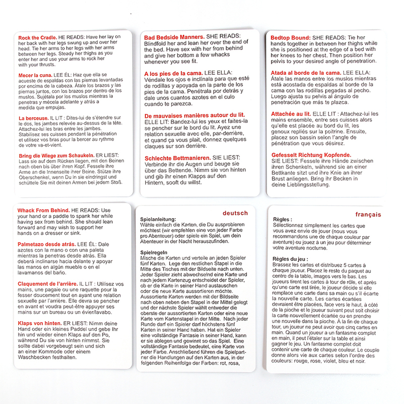 Igrive igralne karte 50 Positions of Bondage iz Kheper Games se lahko uporabijo kot hitri namigi z vključenim zavezovanjem za eksperimentiranje novih možnosti. Igraš lahko tudi priloženo igro kjer tekmuješ proti svojemu ljubimcu, da zgradiš 5-kartno fantazijo, ki vključuje po eno karto iz vsake kategorije izzivov za položaje zavezovanja. 100 000 možnosti obstaja!