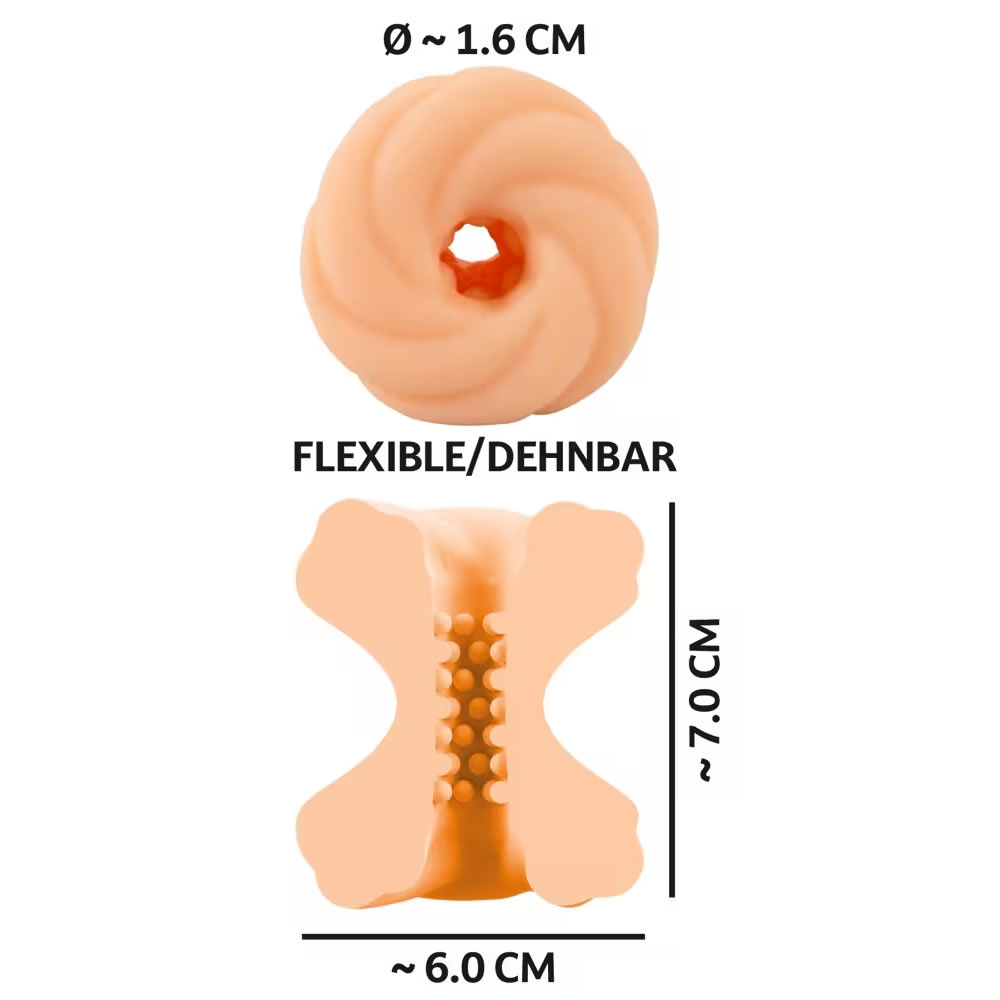 Ta igračka je kombinacija erekcijskega obročka, raztegovalca mod, masturbatorja in odbijača v enem! Zelo elastičen rokav ima zrnasto teksturo v notranjosti. Če obrneš rokav od znotraj navzven, ga lahko uporabiš kot odličen odbijač med seksom tako, da penis ne penetrira pregloboko.