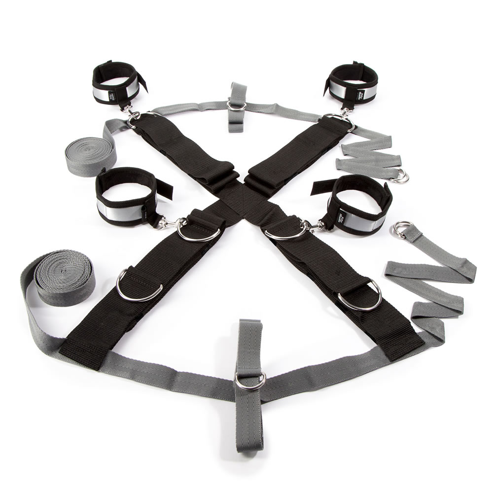 Križ je enostaven za namestitev in ne potrebuje orodja za montažo, le zakonsko posteljo poljubne velikosti. Črne trakove položite v diagonalni križ na vzmetnico z lisicami za zapestja in gležnje na vsakem vogalu. Napeljite tanke sive trakove okoli vzglavja in vznožja vzmetnice, pri tem pa pazite, da 2 D-obročka ostaneta na vrhu. Napeljite trakove skozi D-obroče in jih zategnite.