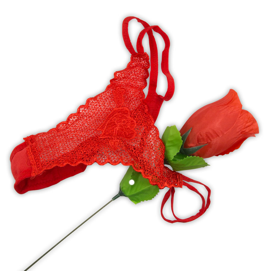 V cvetu vrtnice so skrite tanga hlačke v vroči rdeči barvi. Sprednji del hlačk je iz prosojne mrežice, na bokih sta 2 elastična paščka. Hlačke so v eni velikosti, ki ustreza konfekcijski št. S – L.