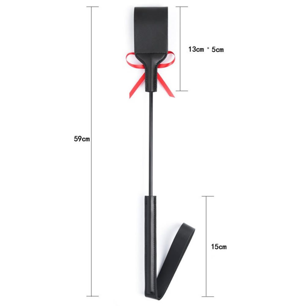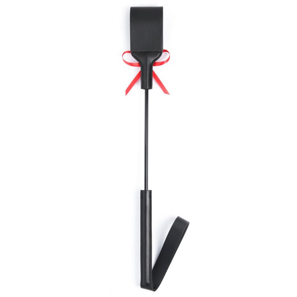 Kratek jahalni bič s plastičnim ročajem. Konica ima široko zanko iz umetnega usnja, okrašeno s srebrnimi kovinskimi zakovicami in rdečo pentljo s svetlikajočim diamantkom.