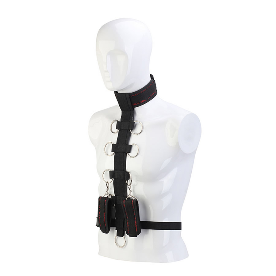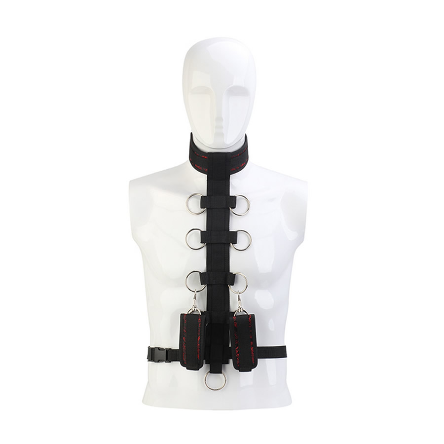 Jermenje za privezovanje z ovratnico in lisicami. Lisice in ovratnica se lahko odstranijo, izdelane so v črno rdeči vezeni kombinaciji. Jermenje se lahko uporabi na sprednji ali hrbtni strani telesa. Ovratnica in lisice so nastavljive dolžine, zapenjajo se z velcro paščkom (ježki). Jermen, ki gre okrog pasu, je ravno tako prilagodljive dolžine. Lisice se lahko s karabinom pričvrstijo na kateregakoli od 9 obročev, lahko pa pripnemo tudi katerikoli drug bdsm izdelek kot so dodatne verige, uteži…