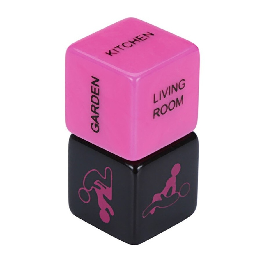 Igralni kocki za zabavno in avanturistično spolnost! Kocki sta v črno-roza kombinaciji; ena kocka vsebuje seksualne položaje, druga pa prostore v katerih ta položaj izvajamo. Uporabimo lahko obe kocki hkrati, ko to ni mogoče, pa samo črno kocko s seksualnimi položaji.