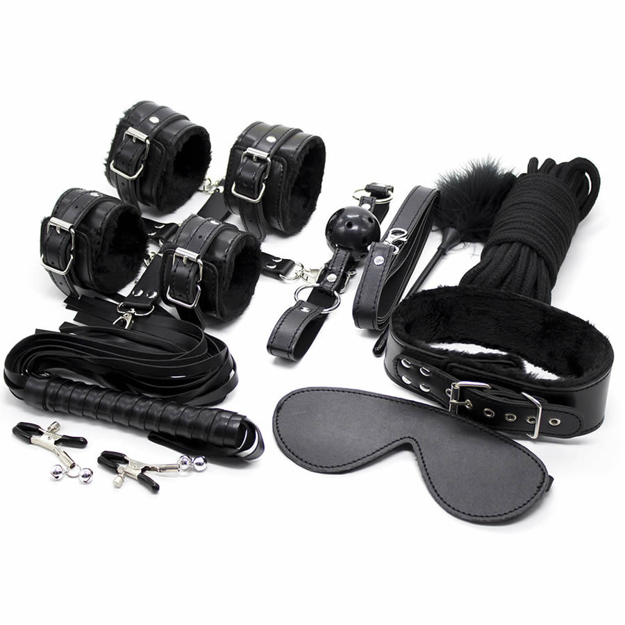 Odličen set za bdsm entuziaste vsebuje lisice, masko, ovratnico, povodec, gag, bič, vrv in ščipalke.