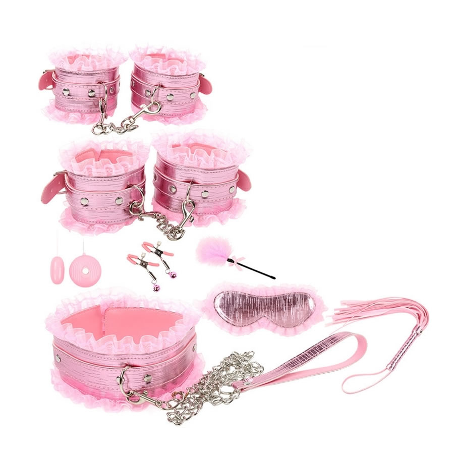 Set bdsm izdelkov v trendovski roza barvi je sestavljen iz vseh najbolj pogosto uporabljanih bdsm izdelkov, dodan pa mu je še vibracijski jajček: