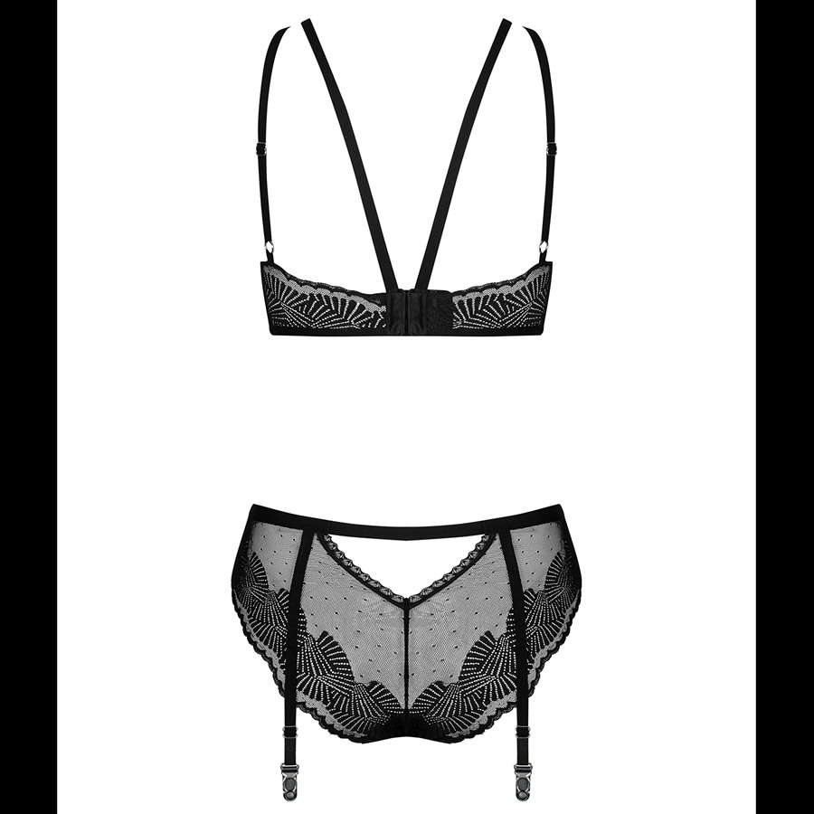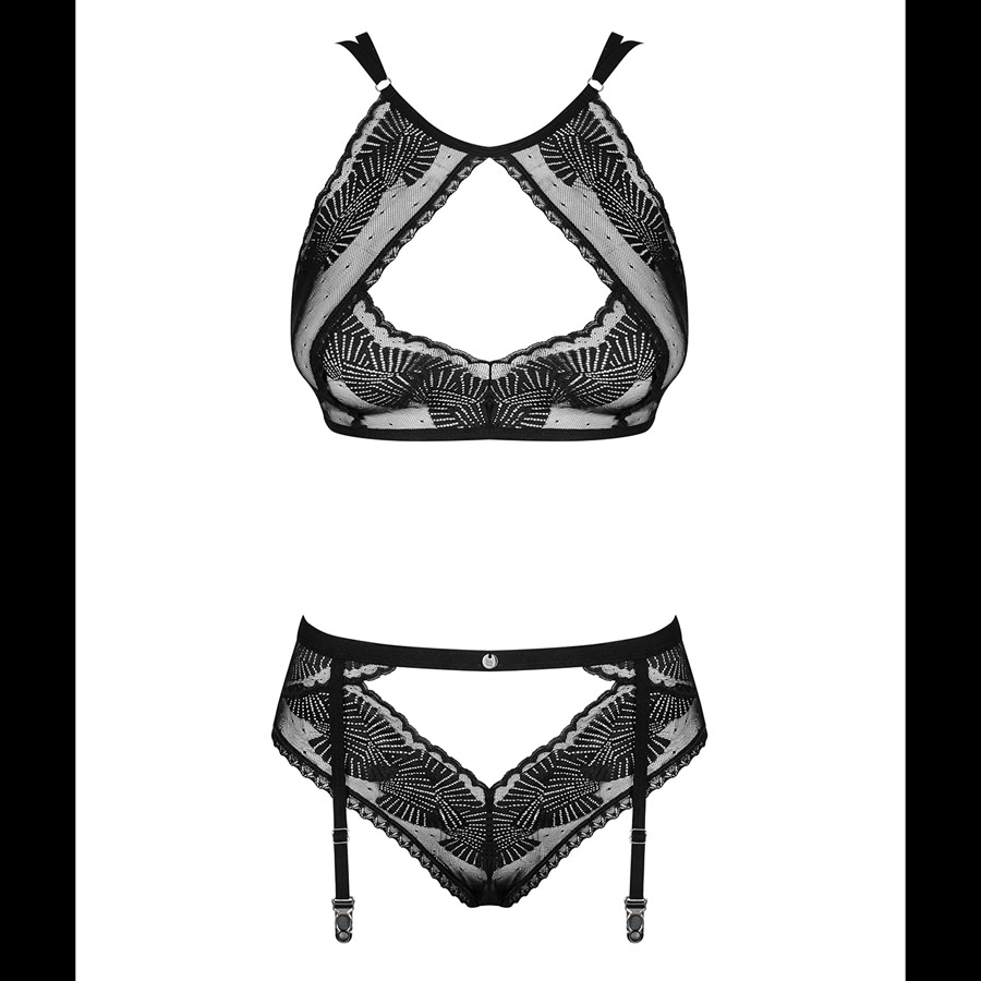 Dvodelni komplet ženskega perila sestavlja mehak modrček in slip hlačke z dodanimi paščki za pripenjanje nogavic. Modrček je oblikovan kot top s poudarjenim izrezom na dekolteju. 2 naramnici imata prilagodljivo dolžino, da ustrezata vsaki postavi. Hlačke so srednje visoke, s poudarjenim izrezom nad spolovilom. Pod popkom jih krasi srebrn obesek. Hlačke imajo 4 paščke za pripenjanje nogavic. Paščki imajo prilagodljivo dolžino.