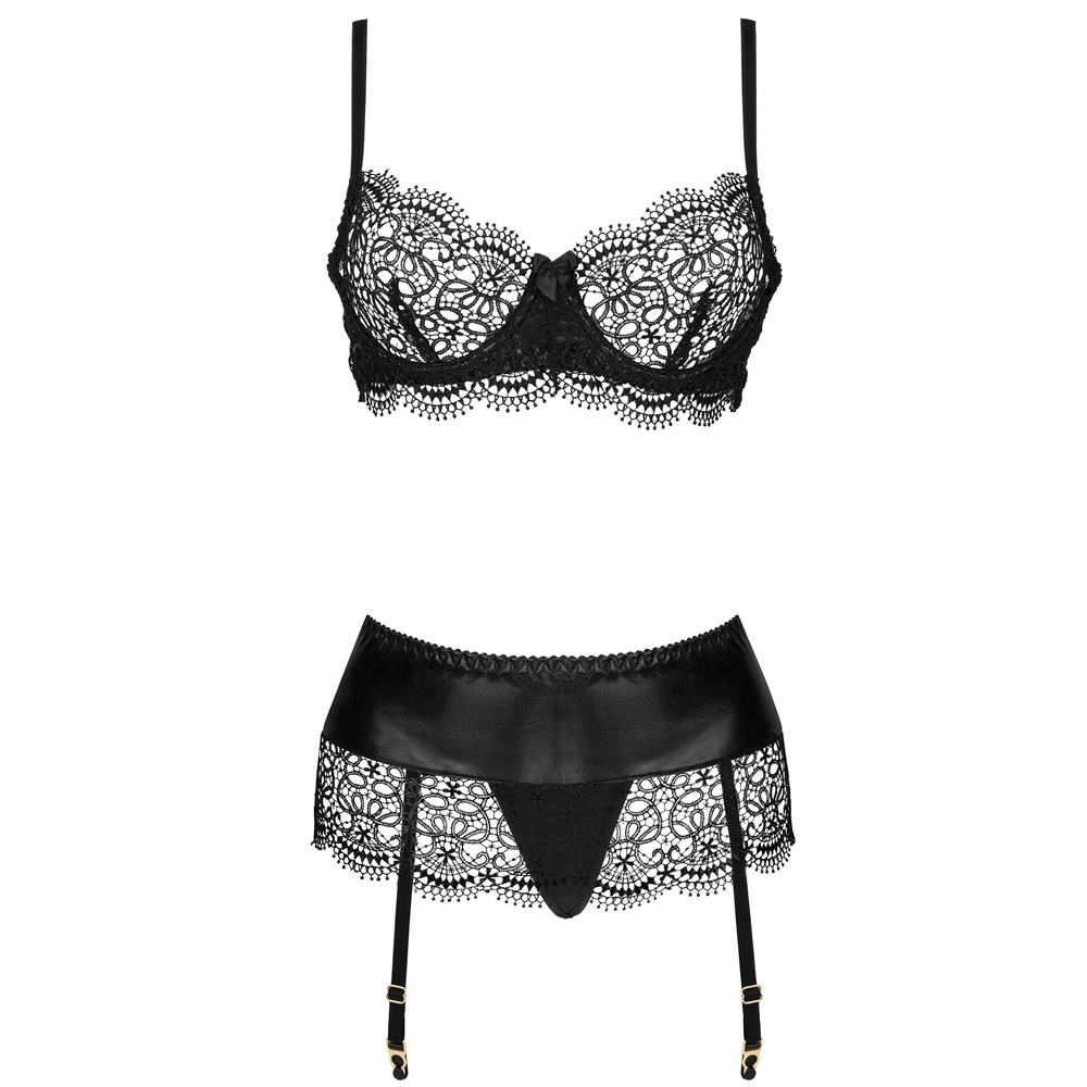 Odkrijte čutnost in eleganco s kompletom Adelia, ki je zasnovan tako, da poudari vašo ženstvenost in okrepi vašo samozavest. Komplet vključuje modrček, podvezico in tangice, ki ustvarjajo edinstveno kompozicijo za posebne priložnosti.