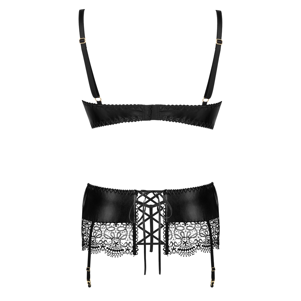 - Material Wetlook in gipur čipka: Kombinacija teh dveh materialov daje kompletu eleganco in prefinjenost.