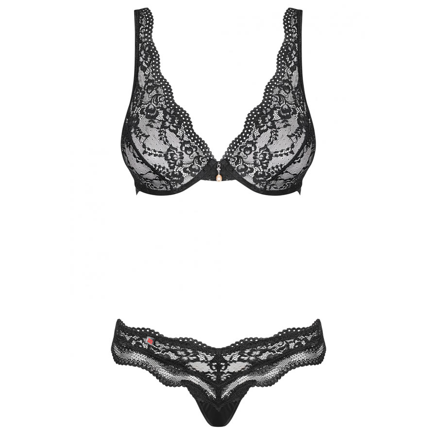 Komplet sestavlja modrček z mehko košarico in hlačke brazilke. Modrček je iz mehke čipke, košarica ima oporo za prsi. Med košaricama je dekorativen obesek s perlo. Naramnice na sprednji strani so obrobljene s pasom čipke, zadnji del se zoži v tanek elastičen pašček katerega dolžina je prilagodljiva. Modrček se zapenja s kaveljčki na hrbtni strani. V kompletu so ujemajoče hlačke v enakem slogu.