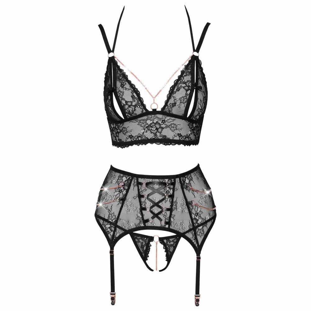 Tridelni ženski komplet iz čipke sestavljen iz modrčka, hlačk z razporkom in pasa za pripenjanje nogavic.