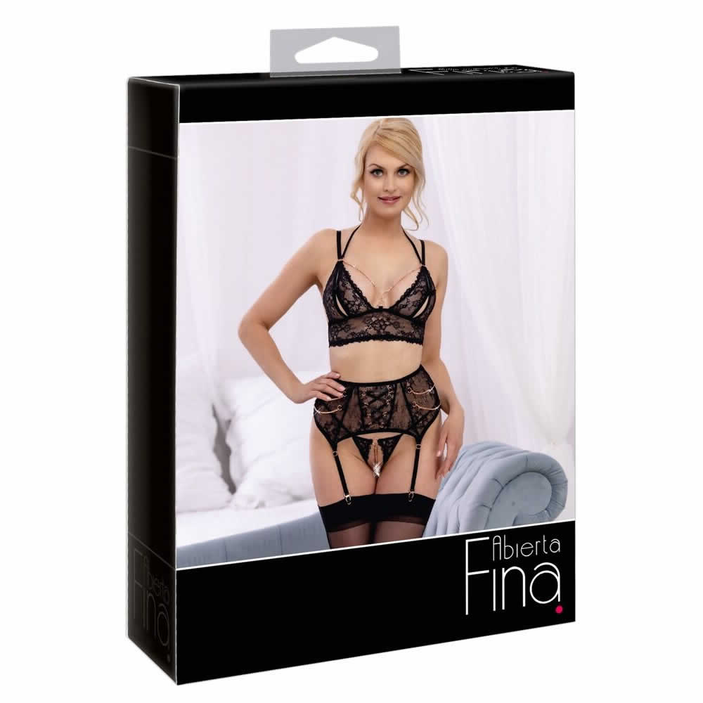 Komplet znamke Abierta Fina vključuje modrček, pas in hlačke brez mednožja. Vsi kosi so izdelani iz nežne in raztegljive čipke ter okrašeni z rožnato-zlatimi elementi in verižicami iz okrasnih kamnov.