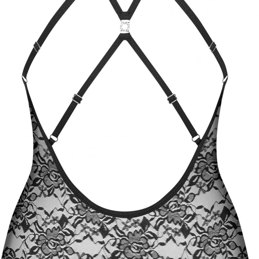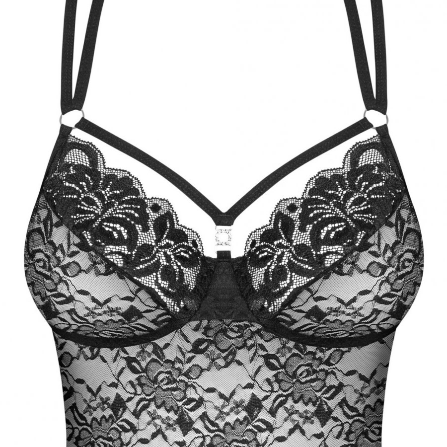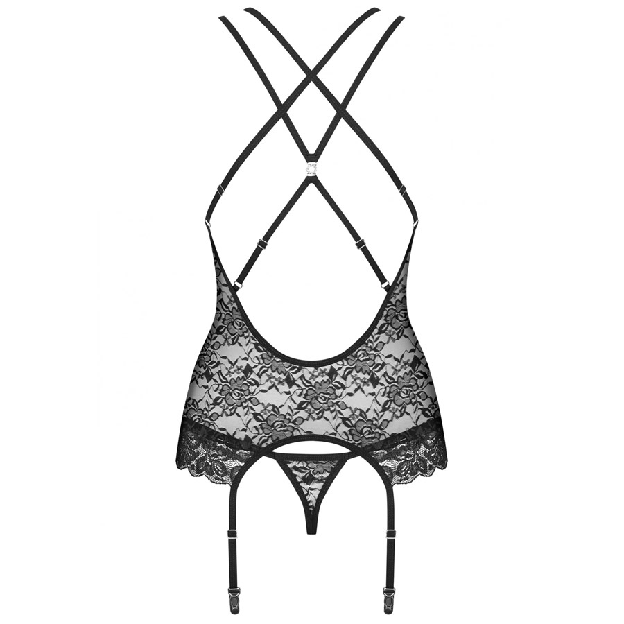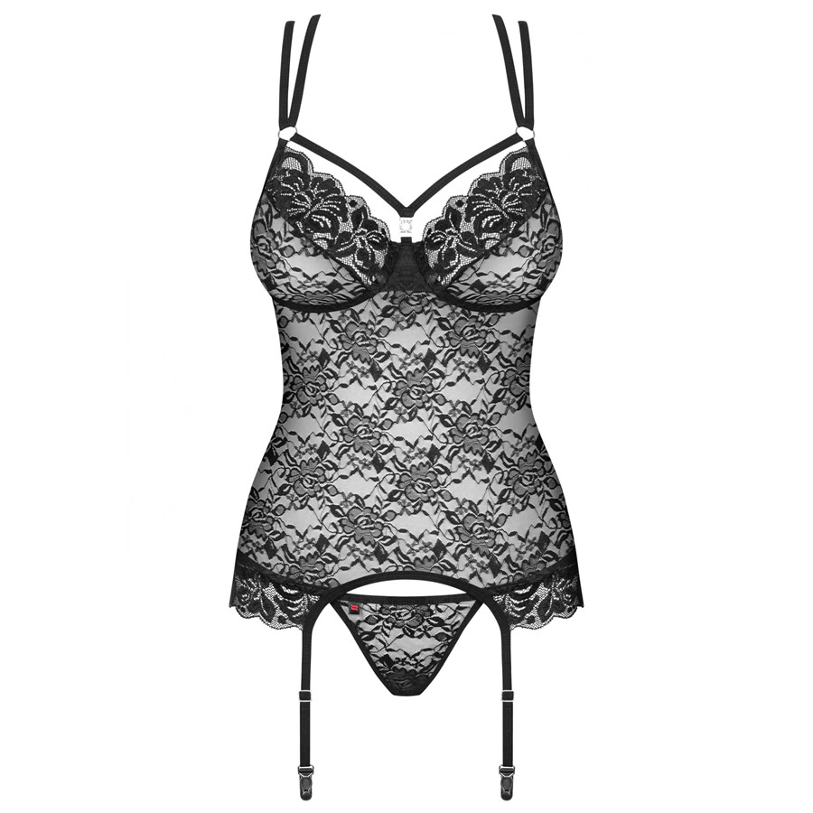 Čudovit, romantičen korzet iz elastične, prosojne rožnate čipke. Korzet ima oporni lok za podporo košaricama, ki sta sicer mehki. Dekolte med njima krasi okrogel srebrn obroček. Iz obročka čez prsi teče pašček, ki poudari tvoje hlebčke. Naramnici sta dvojni, na hrbtni strani se križata, povezuje pa ju enak srebrn obroček kot jena dekolteju. Hrbtni izrez je globok in se konča v višini pasu. Korzet ima 4 paščke za pripenjanje nogavic. V kompletu so ujemajoče čipkaste tanga hlačke.