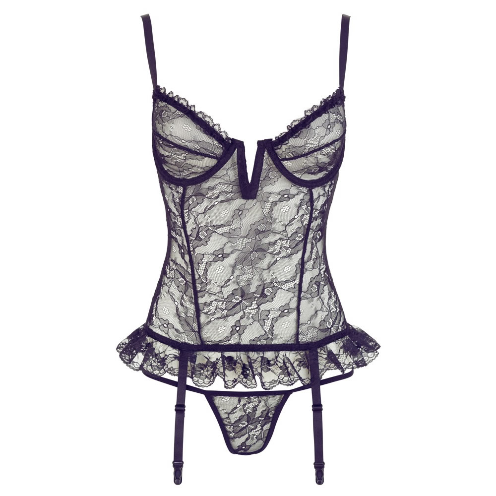 Romantičen korzet iz prosojne čipke v cvetličnem vzorčku. S poudarjenim dekoltejem. Košarici sta mehki, iz čipke, imata vdelano žičnato oporo za prsi. Spodnji del korzeta je s čipkastimi naborki in paščki za pripenjanje nogavic. Priložene so ujemajoče tanga hlačke.