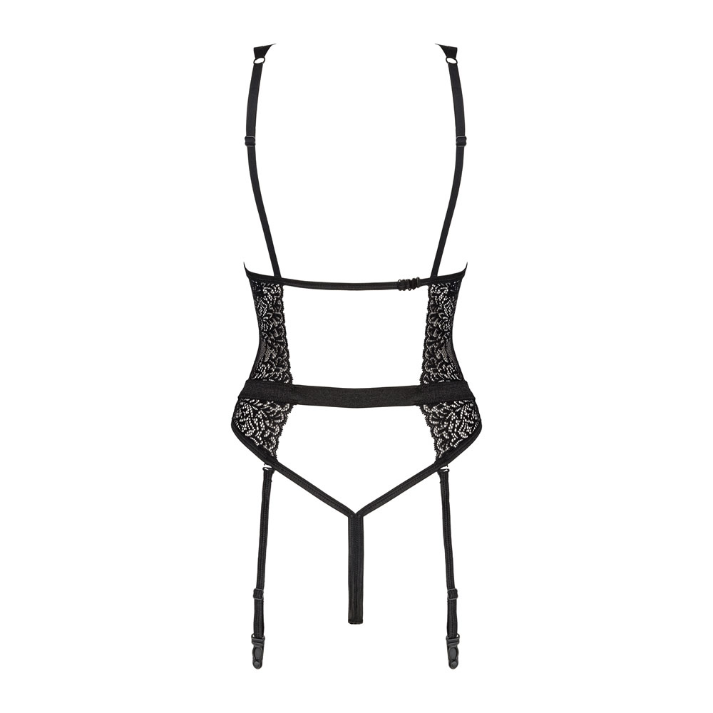 Ta črn korzet iz kolekcije Yaskana je senzualno in ženstveno povabilo za dolg večer z ljubimcem. Seksi paščki čudovito poudarijo figuro in pritegnejo pogled. Klasična čipka doda pridih elegance, stila in prefinjenosti. Izpostavljen odprt hrtbni delje izjemno vnemirjajoč element, ki bo zagotovo prebudil domišljijo. Pomemben dodatek so paščki za nogavice, ki jih lahko kadarkoli odstraniš in ustvariš povsem nov izgled.