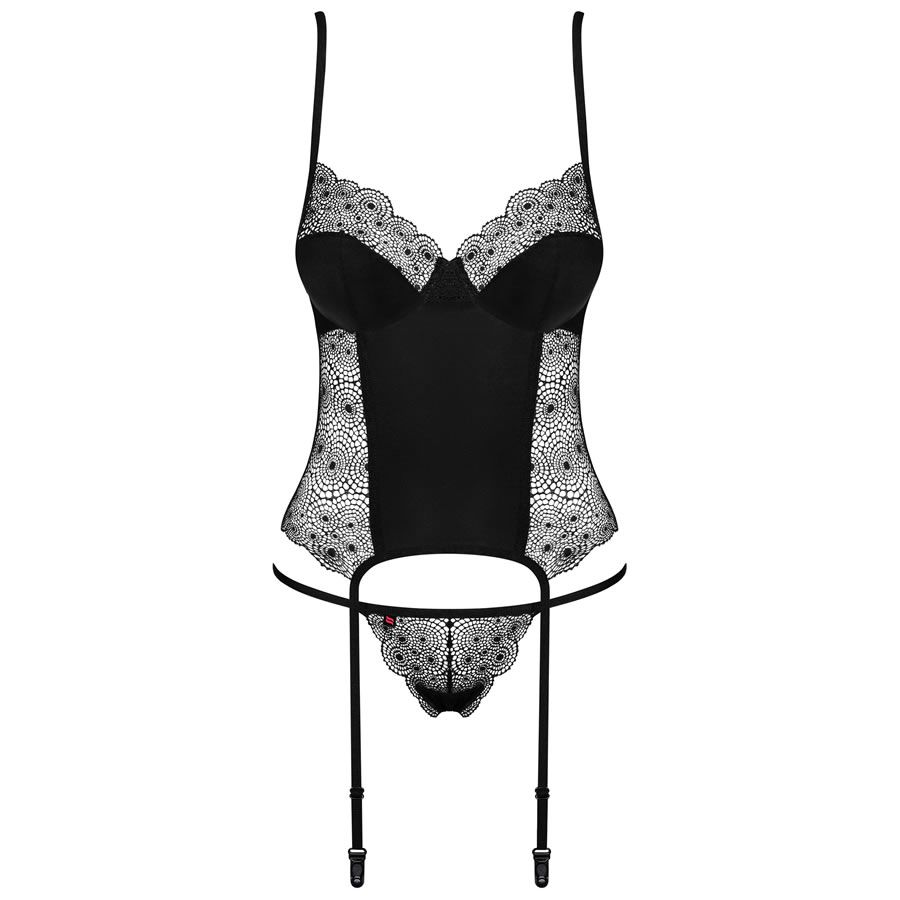 Sharlotte je izjemno ženstven, na pogled privlačen korzet. Zahvaljujoč kombinaciji klasične črne in unikatnega čipkastega vzorca ne moreš mimo njega ne, da bi ga opazila. Čipka na prsih, bokih in hrbtni strani, pa tudi karakteristično zavezovanje – vse to so detajli, ki te bodo naredili še bolj posebno. Korzetu so dodane lepe ujemajoče tanga hlačke.