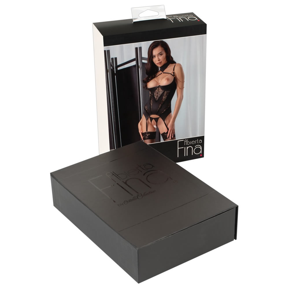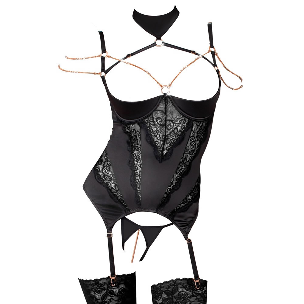 Senzacionalen korzet z odprtima košaricama iz kolekcije Abierta Fina. Korzet je izdelan iz elastičnega satena z vstavki iz čipke in verižico v rose gold barvi, posuto s svetlikajočimi diamantki. Korzet ima oblikovani košarici z oporo za prsi, da jih poudari in naredi za center pozornosti. Poudarek dekolteju doda čudovita kovinska verižica. Naramnici sta povezani med seboj in se združita v mehko ovratnico. Mikro tanga hlačke z razporkom so iz elastičnega satena, v razporku je kovinska verižica.