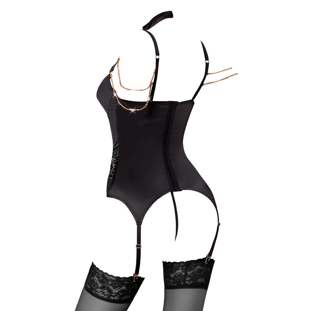Senzacionalen korzet z odprtima košaricama iz kolekcije Abierta Fina. Korzet je izdelan iz elastičnega satena z vstavki iz čipke in verižico v rose gold barvi.