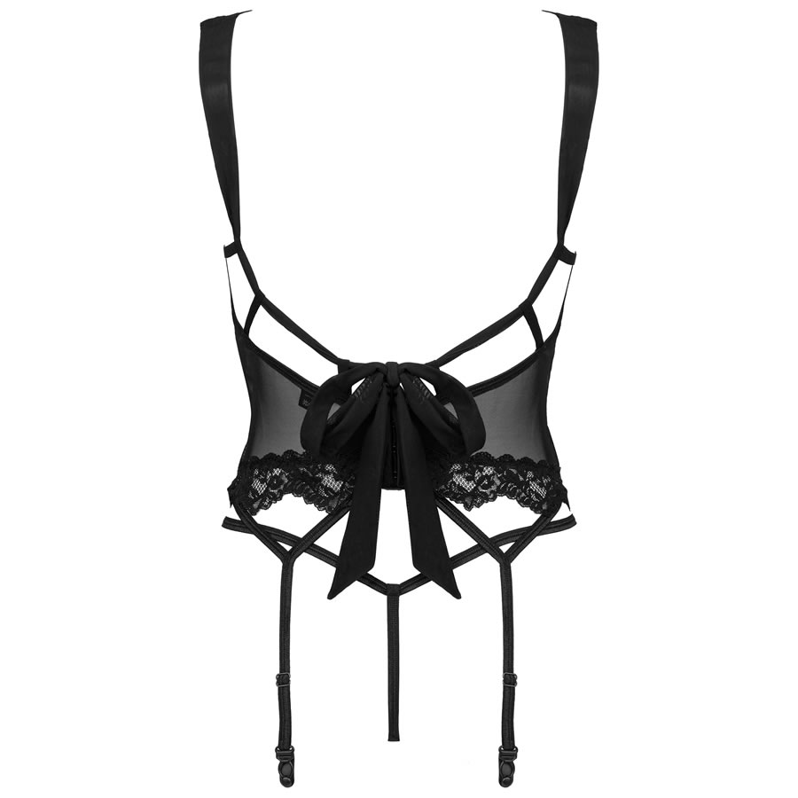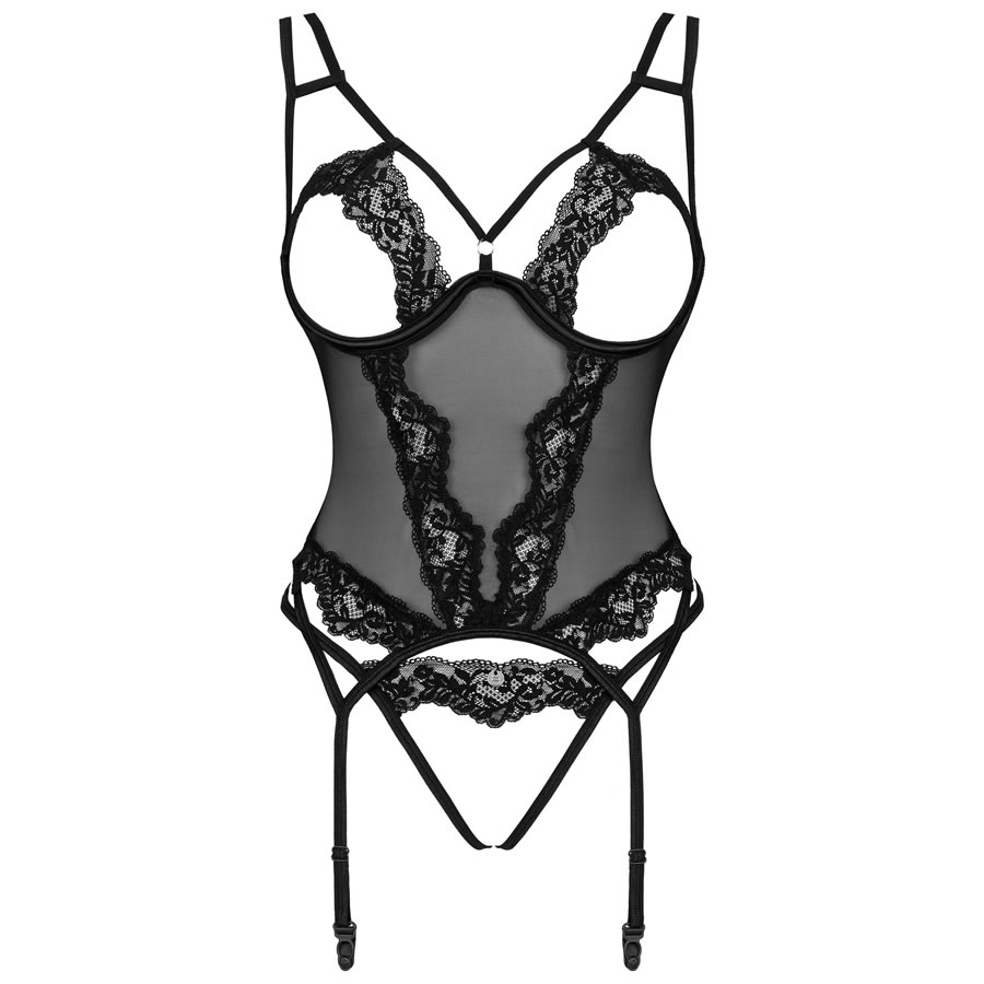 Setilla korzet je hrabra izbira za samozavestne ženske, ki jim je všeč malce začinjenosti. Ta model združuje elegantno krojenje s pridihom modernega oblikovanja. Kombinacija klasične čipke in paščkov, ki poudarijo figuro lahko stimulira domišljijo. Odprti košarici in hlačke z razporkom v razkoraku so udobna in seksi rešitev za vroč večer. Izpostavljen hrbet in zavezovanje v pentljo bosta pritegnila pozornost in dodala delikatnost.