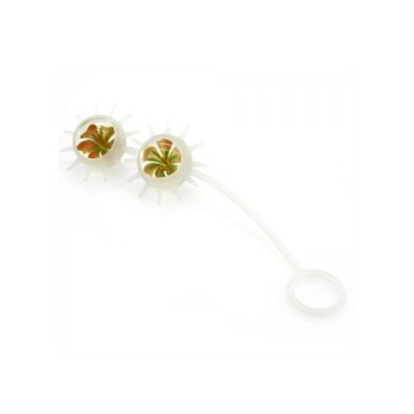 2 stekleni kroglici s čudovitim cvetom v sredini kroglice. Kroglici sta vstavljeni v silikonski rokavček, ki ju drži na mestu. Z zanko za izvlečenje. Steklo je zanimiv material v erotiki, saj nam daje možnost igranja z različnimi temperaturami – lahko ga segrevamo ali povsem ohladimo.