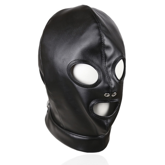 Maska za čez celo glavo, z odprtinami za oči in usta in z mini odprtinicama za nosnici. zdelana iz umetnega usnja. Na hrbtni strani glave se zapne s kovinsko zaponko in trakom za zavezovanje. Povsem prilagodljiva velikost.