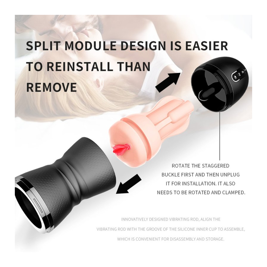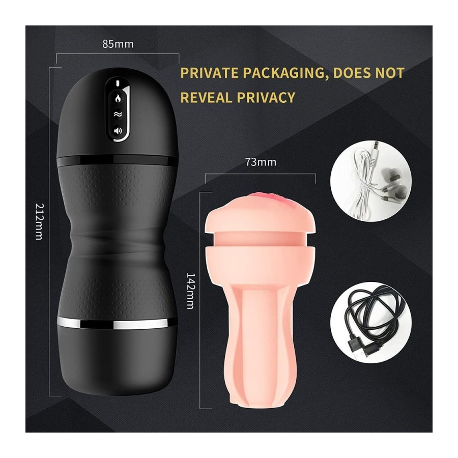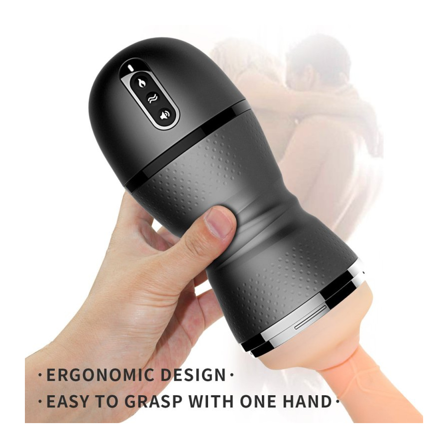 Masturbator v valju ima iz koži podobnega realističnega materiala izdelan masturbacijski rokav. Notranjost tega rokava je bogato strukturirana, da nudi več užitka. Dodatno stimulacijo ustvari tudi močan vibracijski motor z 9 vzorci vibriranja. Da si popolnoma razvnet, se trudi glasovna stimulacija, ki jo slišiš preko priloženih slušalk.  Za dodatno udobje ob uporabi poskrbi vgrajeno gretje, ki masturbator segreje na telesno temperaturo.