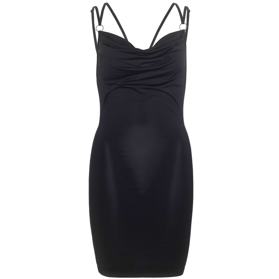 Mini obleka je izdelana iz gladkega elastičnega materiala, ki objame tvoje obline. Obleka ima na prsih mehko gubo, da poudari prsi. Dvojni naramnici sta pritrjeni s kovinskima obročkoma, na hrbtni strani se prekrižata. Dolžina naramnic je prilagodljiva. Obleka ima globok hrbtni dekolte.