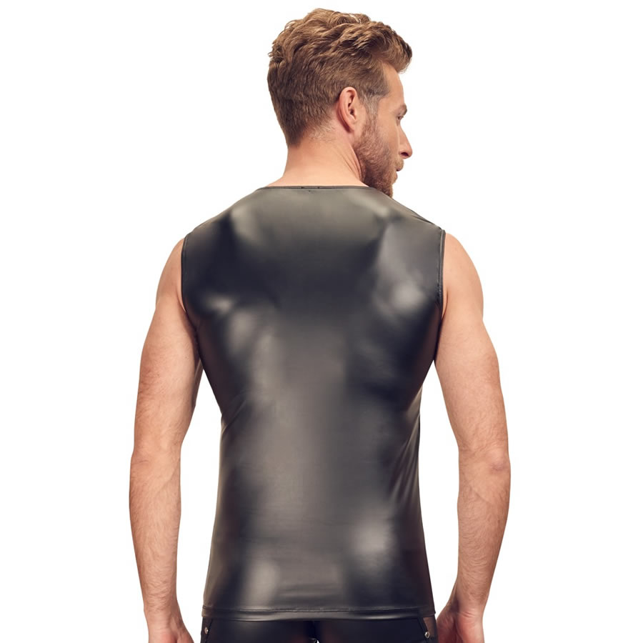 Udobna moška majica iz elastičnega mat wetlooka. Z všitim detajlom – prosojno mrežico in okrasnimi kovinskimi zakovicami. S srebrno zadrgo nad prsnim košem. Majica je povsem oprijeta, da poudari mišice.