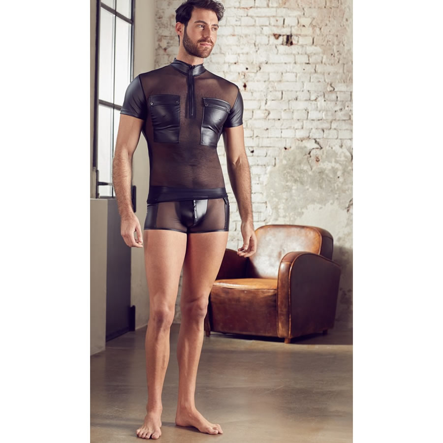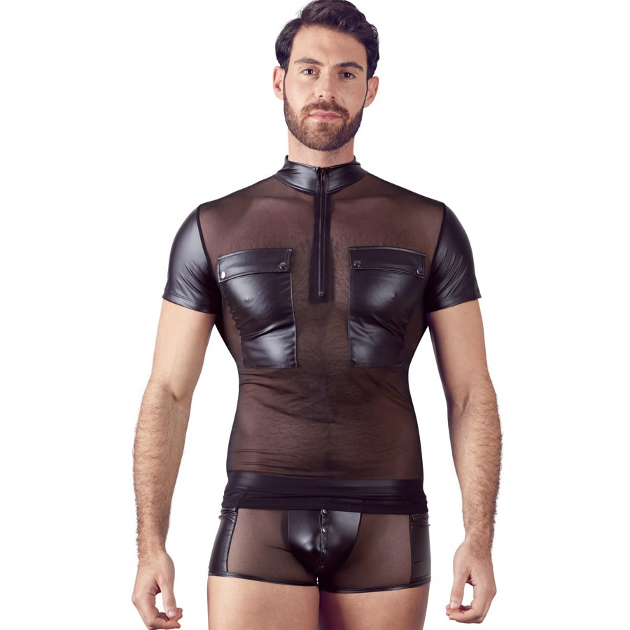 Seksi majica iz prosojne mrežice na sprednji in mat materiala na hrbtni strani. Eleganten sprednji del ima zadrgo,ki odprta poudari moškost.
