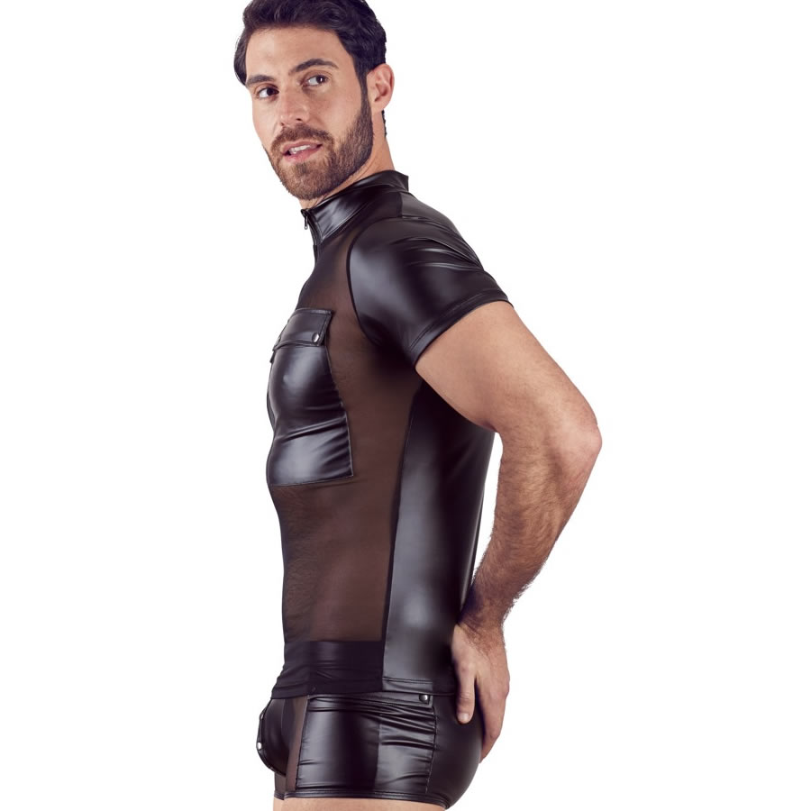 Seksi majica iz prosojne mrežice na sprednji in mat materiala na hrbtni strani. Eleganten sprednji del ima zadrgo,ki odprta poudari moškost, bradavičke so prekrite z žepoma. Hrbtni del majice je iz mehkega wetlooka, ki poudari gibanje mišic.