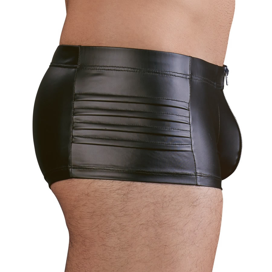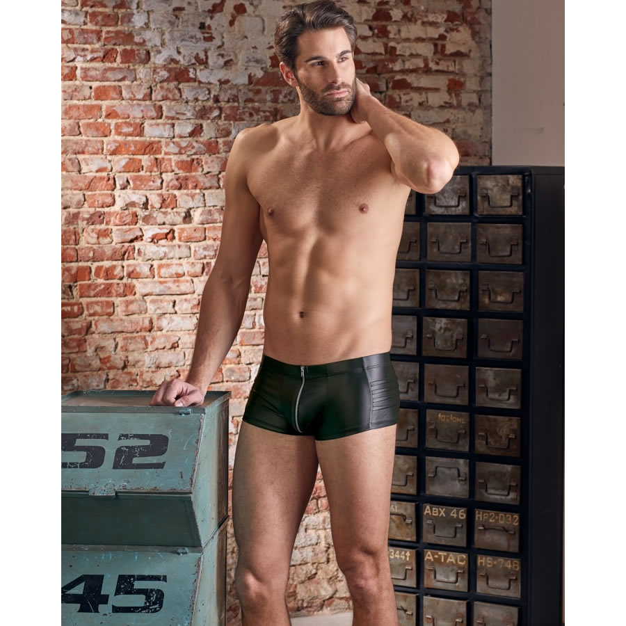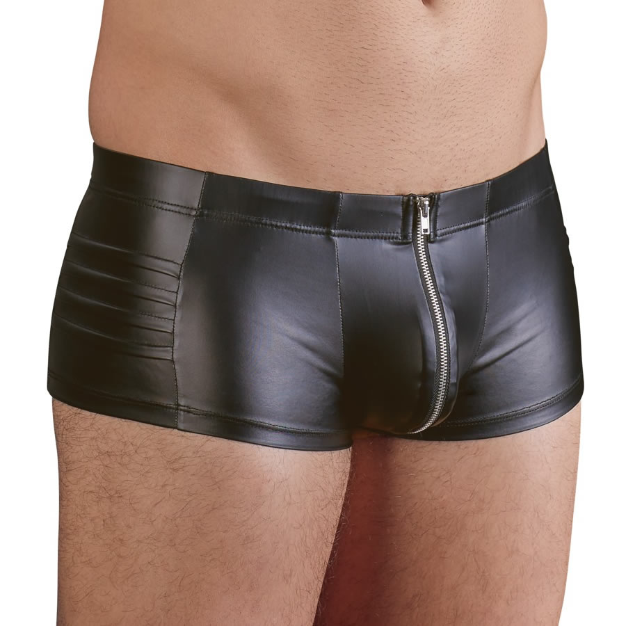 Črne hlačke v modnem matiranem wetlooku s stilskimi prešitimi ornamenti na vsaki strani. S kovinsko zadrgo na sprednji strani. Elastičen in mehek material, z blagom prekrit elastičen pas in visokokvalitetna izdelava naredijo te bokserke za izjemno udobne.