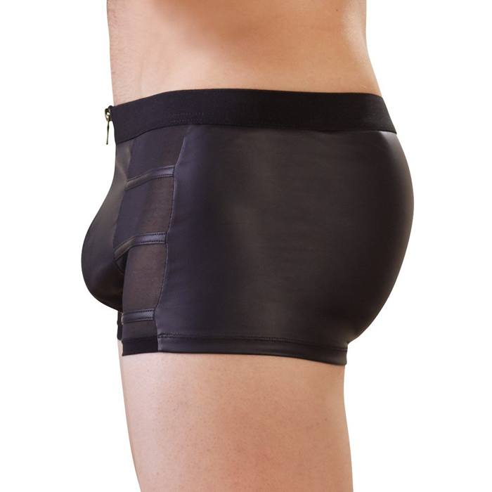 Klasične moške hlačke s kančkom elegance. Izdelane iz kombinacije prosojne mrežice in sijočega wetlooka. Z zadrgo na sprednji strani.
